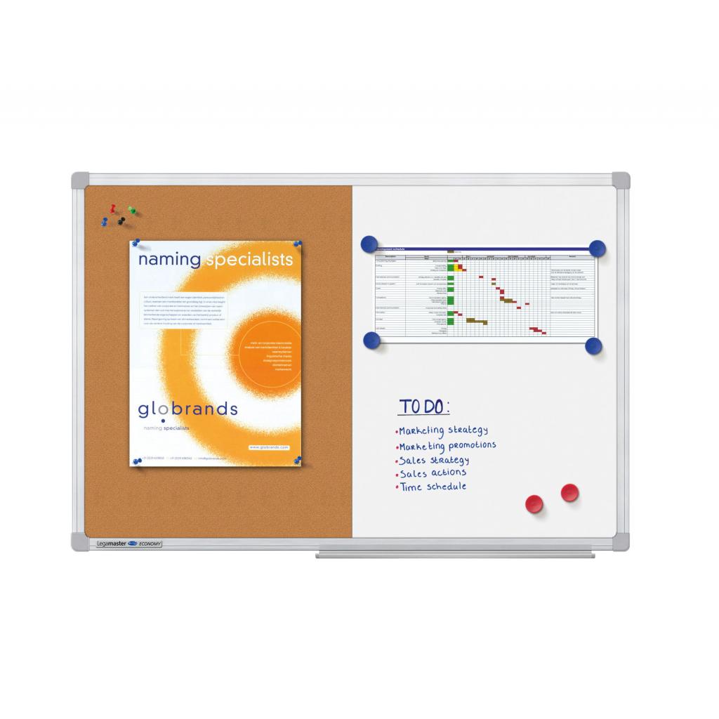 Polovica tabule s povrchom z prírodného korku na oznamy, pripevňované špedlíkmi, druhá polovica biela magnetická tabuľa v lakovanej úprave s výhodami bielej tabule, popisovateľná za sucha stieracími popisovačmi a možnosťou využívania magnetov. Hliníkový rám