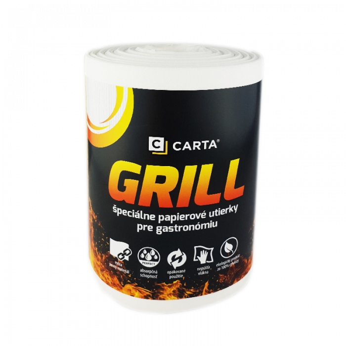 CARTA Grill je špeciálna 1-vrstvová papierová utierka s návinom so 60 útržkami. Unikátna technológia spracovania wetlaid paper prináša špeciálne vlastnosti materiálu, najmä extra vysokú savosť a pevnosť aj za mokra. CARTA Grill je vyvinutá a priamo určená pre použitie v gastronómii a pre domáce použitie