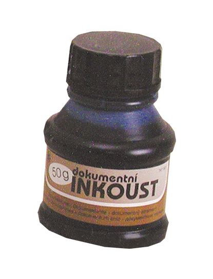 Dokumentačný atrament čiernej//modrej farby vo fľaštičke s obsahom 50 g.