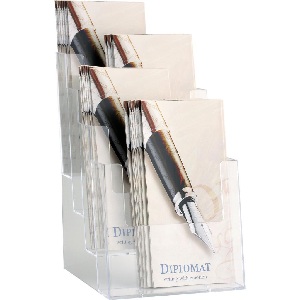 Stojan na prospekty formátu A5 so štyrmi oddielmi. Materiál priehľadný číry plast. Rozmery (š x v x h) 165 x 260 x 155 mm.
