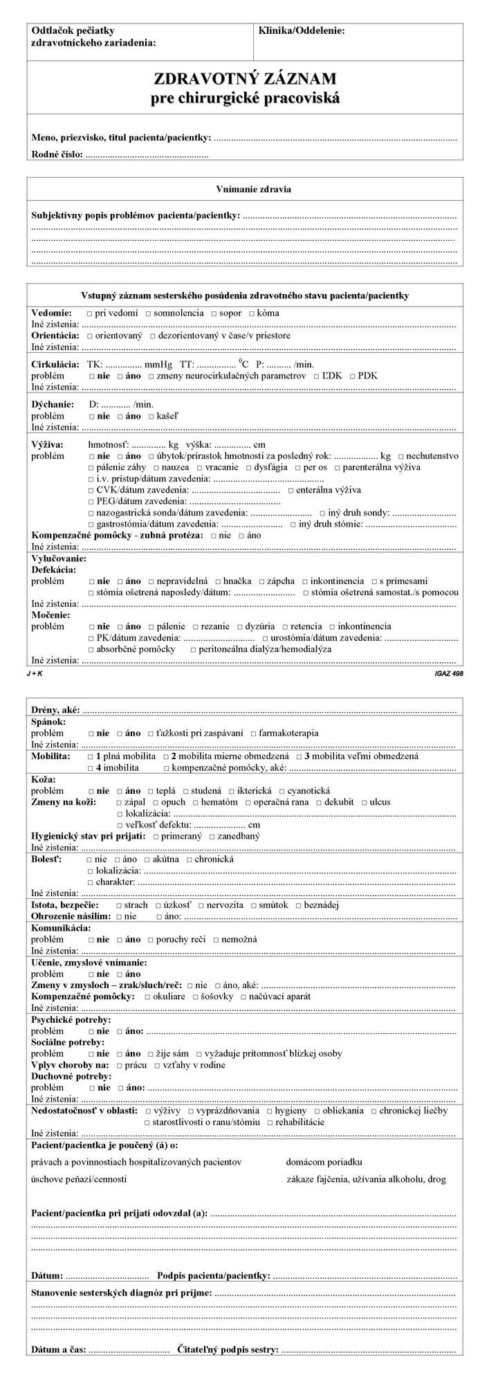 Zdravotný záznam pre chirurgické pracoviská A4