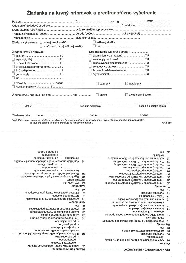 Žiadanka na krvný prípravok a predtransfúzne vyšetr. A4